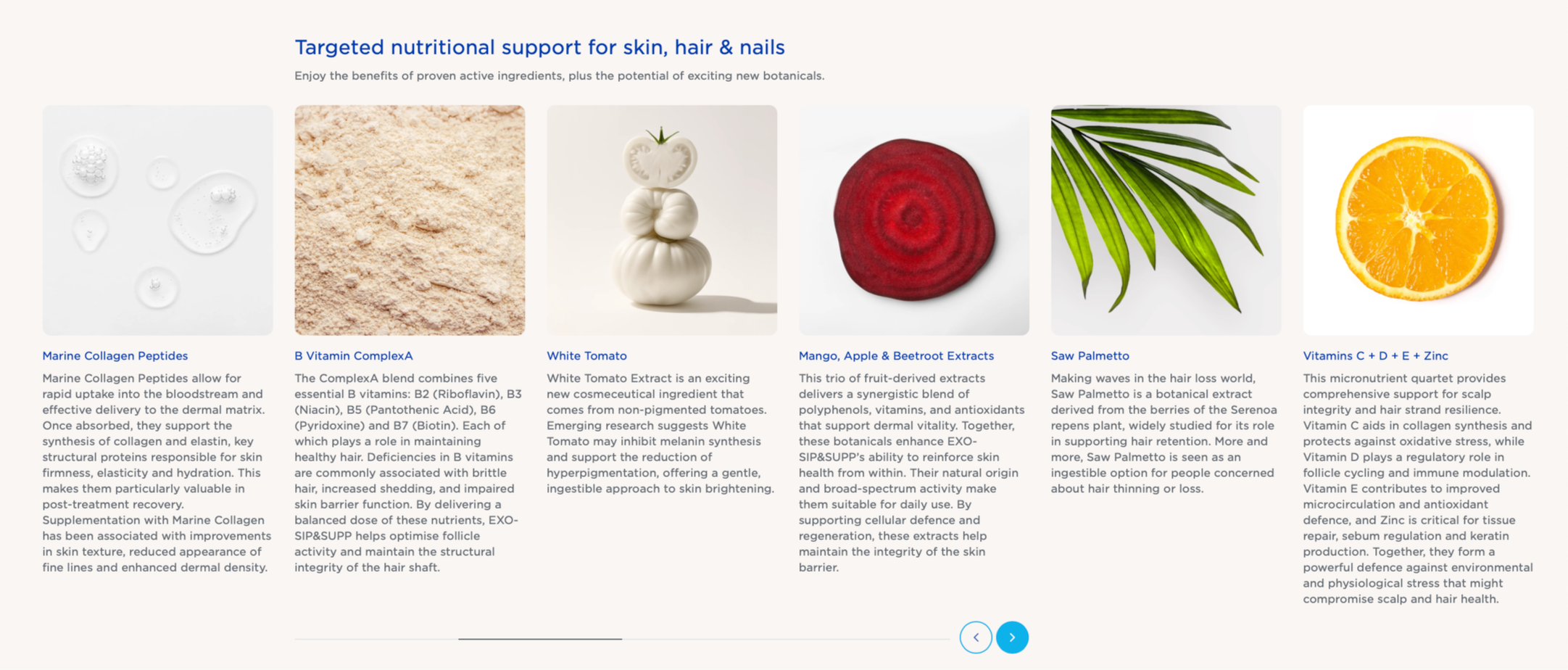 DermapenWorld is a leading skincare brand for the global medical and aesthetic markets. In mid-2025 I helped them launch EXO-SIP&SUPP, their first skin, hair and nail supplement. This involved the full range of comms for B2B and DTC including ads, landing pages, EDM journeys, sales support, point-of-sale etc.