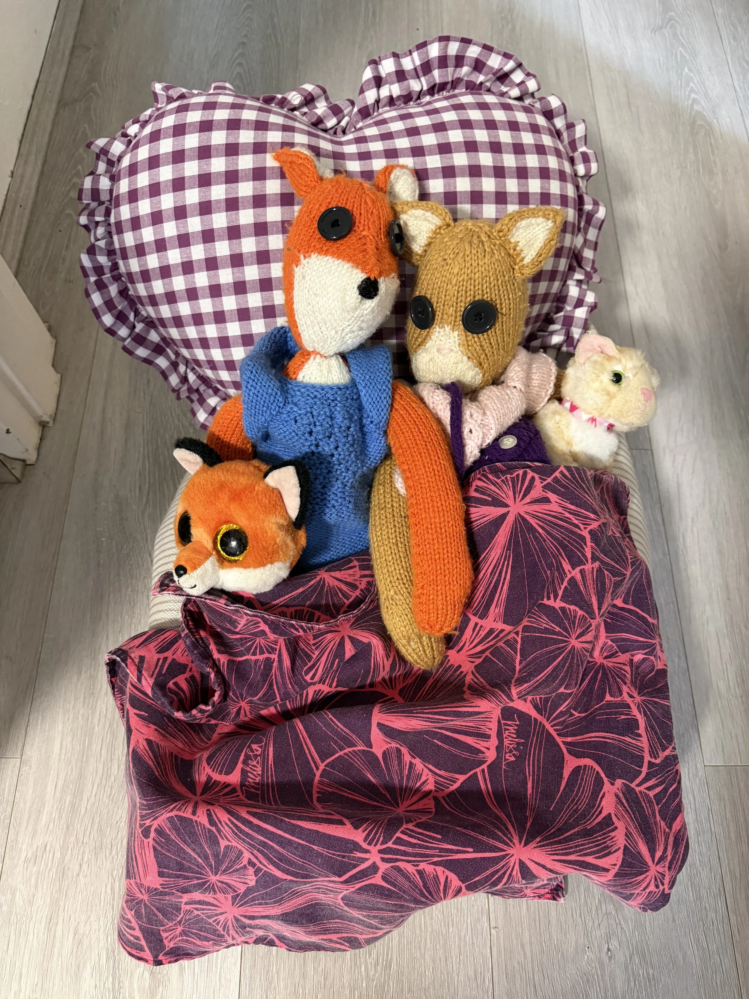 The big fox is Roxy, the big cat is Marshmallow, the small fox is Rosey and the small cat is Milo. Roxy and Marshmallow were made by my Grandma. She knitted them that’s why they are special. It made me feel happy and impressed that she was able to knit the heads and tails.